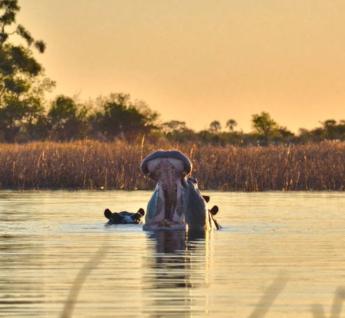 Hippopotamuses are large, semi-aquatic mammals endemic to Africa, characterized by their massive bodies, short legs, wide mouths, and thick, mostly hairless skin. They spend most of their time in water or mud to keep cool and hydrated. Hippos primarily come ashore at night to graze, being herbivores. Despite their bulky appearance, they can run surprisingly fast and are highly territorial and aggressive, considered one of Africa's most dangerous animals. Their mouths can open to an extreme angle, revealing large canine teeth.