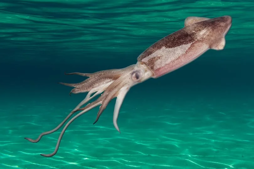 Squid are marine cephalopod mollusks, closely related to octopuses and cuttlefish. They possess a symmetrical body, ten appendages (eight shorter arms and two longer tentacles), and a muscular structure called the mantle. Squid are found in oceans worldwide, from shallow waters to the deep sea. They are carnivores, feeding on fish, crustaceans, and krill. Squid utilize a jet propulsion system (expelling water from a siphon) for rapid movement and can change their skin color for camouflage or communication. They also serve as an important food source for many larger marine animals.